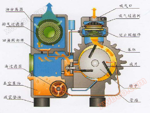 2. The suction port of the XD rotary vane vacuum pump is equipped with a coarse filter made of metal wire mesh. It can prevent solid foreign dust particles from being sucked into the pump chamber. An exhaust transition device with efficient oil and gas separation effect is installed inside the oil separator. When the pump is stopped, the suction valve built into the suction port isolates the pump from the pumped system, preventing the pump oil from returning to the pumped system. The pump is cooled by air. All pumps are driven by directly connected electric motors through elastic couplings.